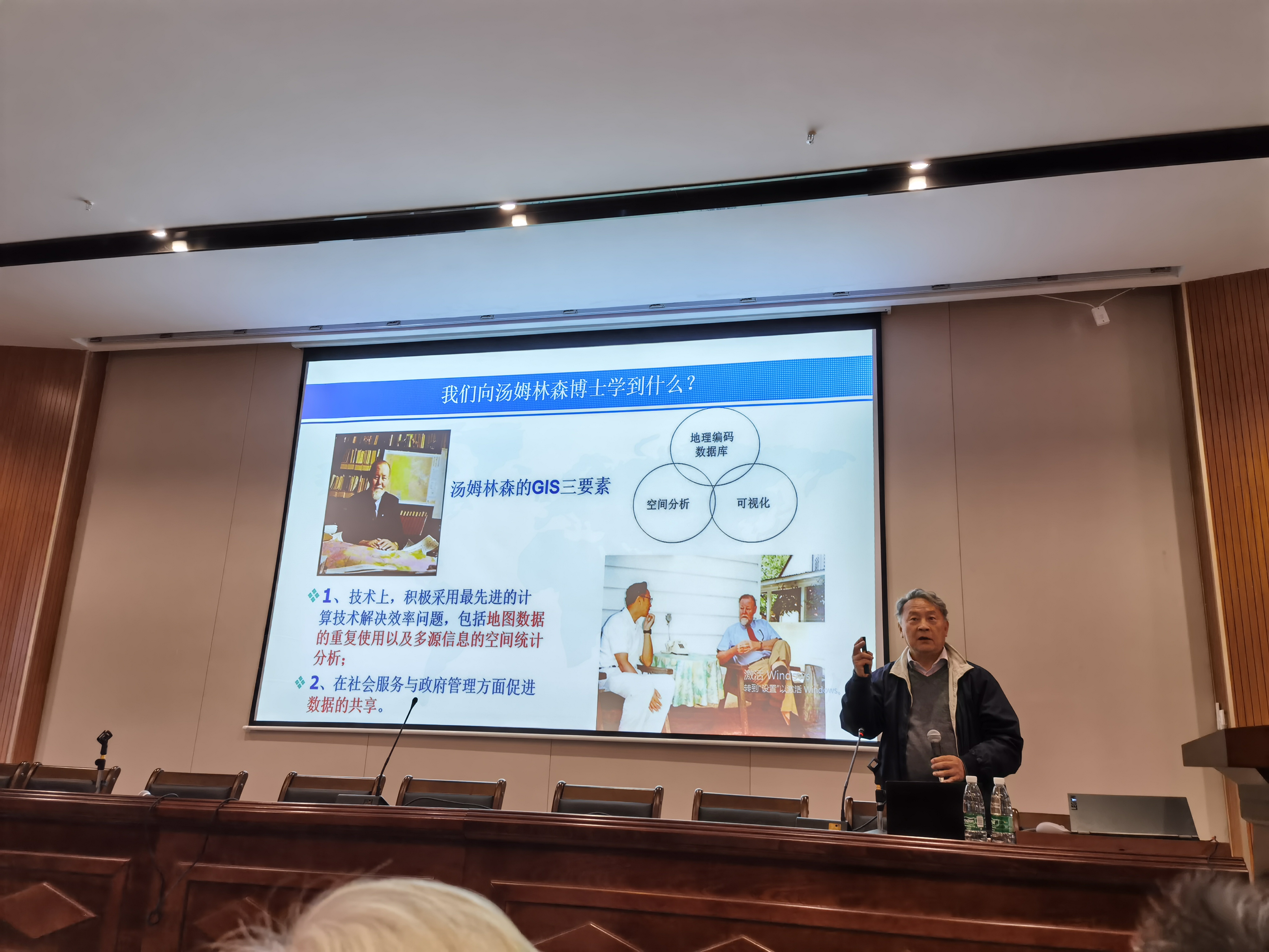林珲教授介绍人类对地理环境的认知过程可以分为三个阶段,获取地理信息、研究地理实体管关系、探索地理过程以及总结地理规律;林珲教授介绍了集成地理编码数据库与地理过程模型库的虚拟地理环境技术正成为实验地理学的新方法。由于时间不够充裕,现场没有安排互动时间,在座师生表示较为遗憾。