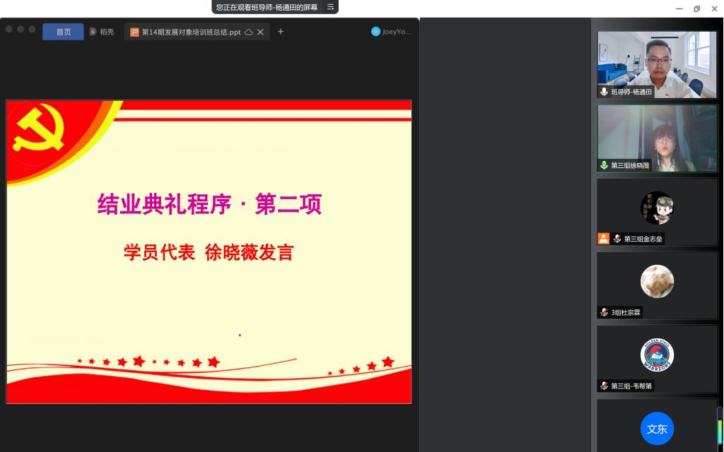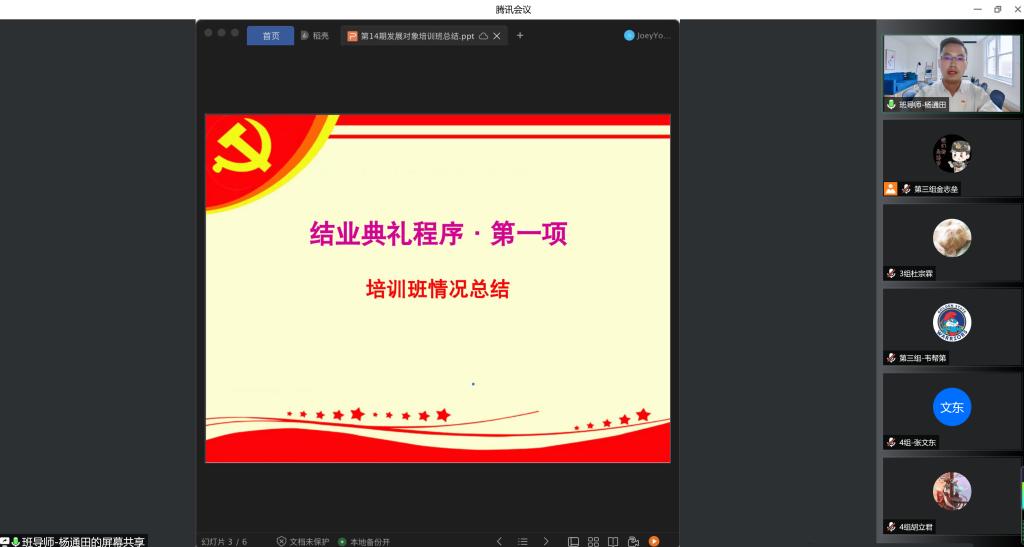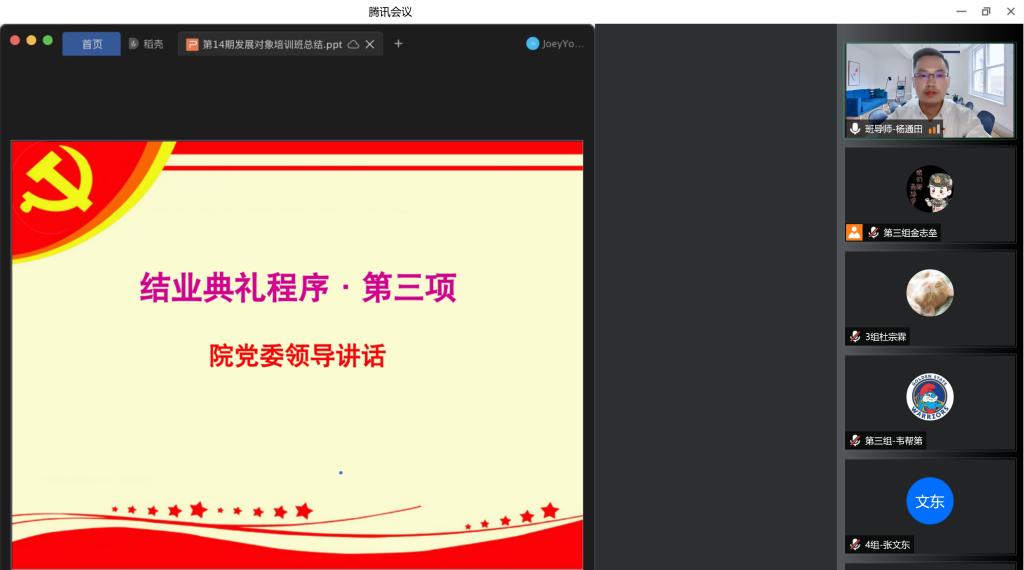 2022年5月19日,yl23411地信公司党委分党校第14期发展对象结业典礼以线上会议的方式顺利举行。本次结业典礼由培训班班导师杨通田老师主持,培训班全体67名学员参加。