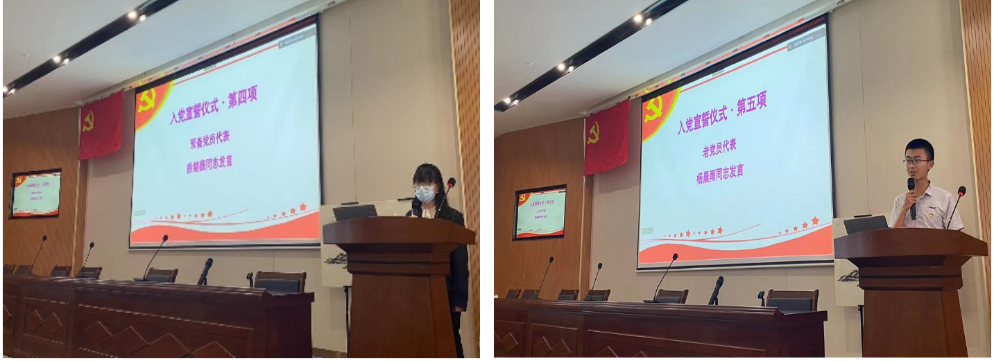 大会第一项,与会预备党员进行集体入党宣誓仪式。宣誓仪式在庄严雄伟的《国歌》中拉开帷幕,彭光雄老师宣读预备党员名单后,由李建军老师领誓,76名预备党员面向党旗,全体与会党员举起右手,向鲜红的党旗庄严宣誓。宣誓结束后,预备党员代表徐晓薇同志发言,呼吁全体预备党员争做时代先锋,一同建设社会主义现代化强国。紧接着,老党员代表杨晨雨同志分享了自己读书时的故事,倡导新党员要勇于站出来亮出自己党员的身份,一同书写出靓丽的青春答卷。