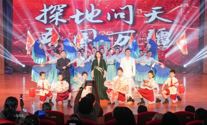 该节目以探地问天的科技报国精神为核心,将地球科学学科特色融入舞台艺术童声、流行、美声、京剧、扇舞与旗舞有机融合,各绽光彩。童声合唱拉开序幕,娓娓道来,明亮清澈。女教师们一袭青绿长裙,以柔美扇舞翩然登场,她们手持扇轻盈翻转,层层叠叠流动线条勾勒出如《千里江山图》一般的秀丽景象。主唱部分流行与美声跨界演绎,精心编排的和声跌宕起伏,委婉动听,红日霞光仿佛在歌声中浑然一体。清脆的板声打破抒情的氛围,男教师们踏着京剧节奏举旗登场。京剧唱段改编自经典作品《定军山》选段,铿锵锣鼓声中,新编唱词探地宝、绘碧霄、凿岩峤、问天高韵味流转,与大屏幕上公司科研攻关的创新瞬间、课堂教学的生动画面、师生共创的累累硕果相映生辉旗舞阵阵,在刚柔并济间诠释学科魅力展现出地信师生丈量大地、逐梦深空的豪情。尾声全员合唱,热闹非凡,舞台灯光汇成星河,探地问天吾国万疆的京剧念白气势如虹,将现场气氛推向高潮。