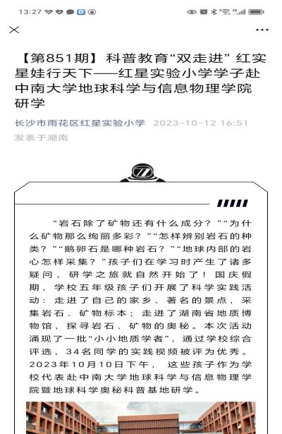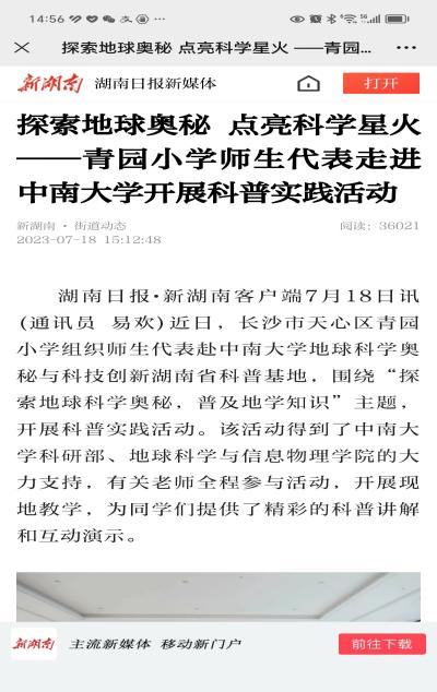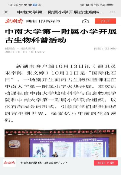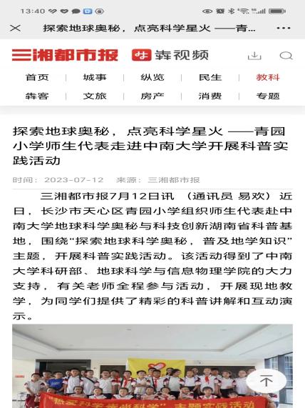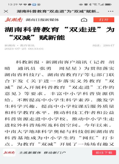 2023年5月24日,2023湖南省科技活动周启动,湖南卫视午间新闻特别报道宣传了我基地。随后,湖南日报、三湘都市报和长沙晚报等相继报道了中小员工来我科普基地开展研学活动的新闻。