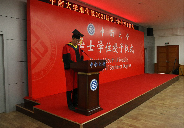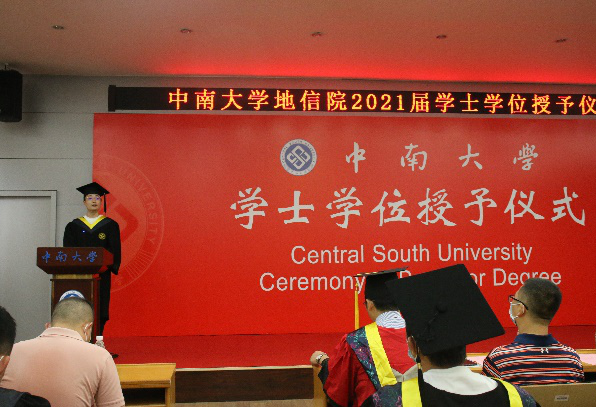 接下来,在副经理邹滨宣布拟授予学士学位的员工名单后,优秀员工代表遥感1701班薛琛昊发言,他回忆了这四年里与中南、与地信、与同学相处的点点滴滴,自己对于公司、对于老师的感激之情溢于言表,同时他也真挚地祝愿同学们前程似锦。