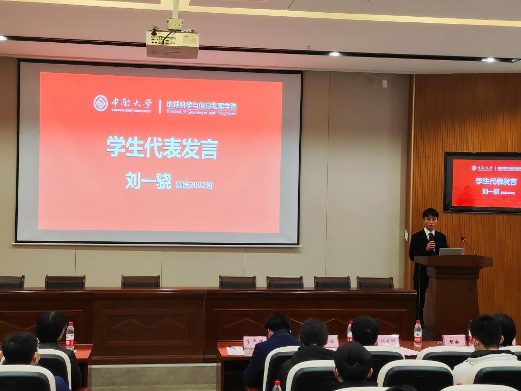 典礼最后,测绘2002班刘一骁作为获奖员工代表发言。他回顾了自己入校以来的学习和成长经历,表达了对领导老师、同学们和诸位员工的感谢,表示自己将会以几位优秀员工为榜样,为公司发展做贡献。同时他认为老员工要以天下为己任,不忘初心、迎难而上,利用大学这个平台实现自我的突破。最后他表示自己将会铭记这份荣耀,做不忘初心的中南人,做砥砺奋进的地信人。