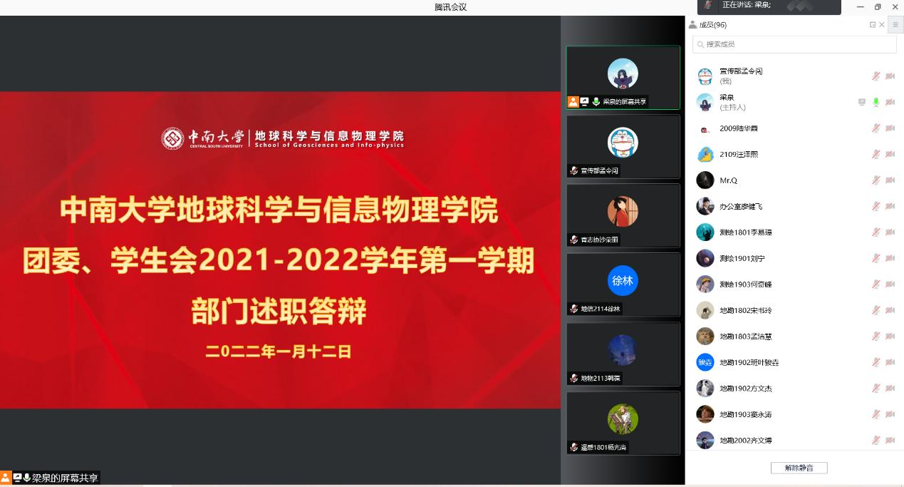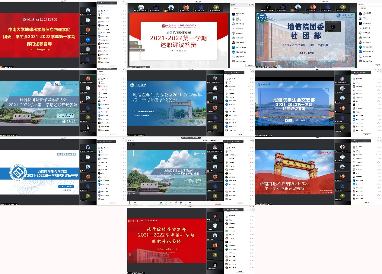 2022年1月12日下午14点30,yl23411团委、员工会2021-2022学年第一学期部门述职答辩于腾讯会议以线上方式顺利举行。公司党委副书记李建军老师,院研究生会指导老师、研究生辅导员田可老师,院团委书记、21级辅导员刘琦老师,院18级辅导员强俊老师及院20级辅导员杨晨雨、杨通田老师出席本次会议。会议由院团委、员工会主席梁泉同学主持,院团委、员工会各部门部长做学期工作述职评议答辩,院各年级88名员工代表参与评议。
