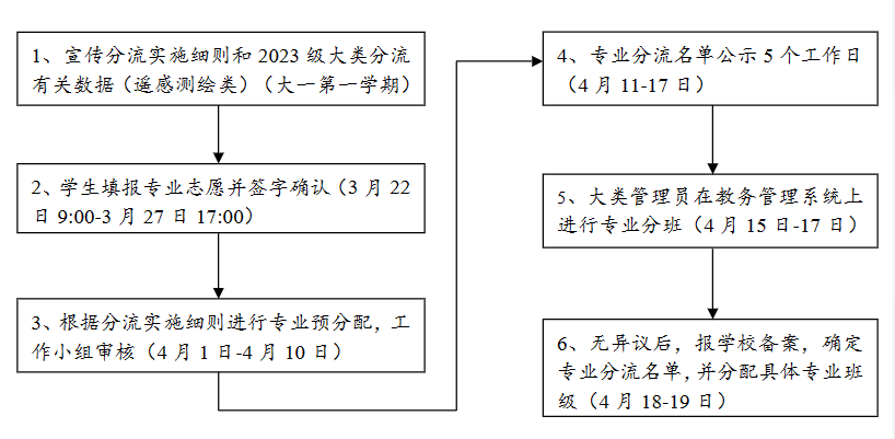 按照本科生院的工作安排,大类内专业分流工作从3月22日填报志愿开始,至4月17日公示结束,19日本科生院更新分流员工学籍信息,工作流程具体如下: