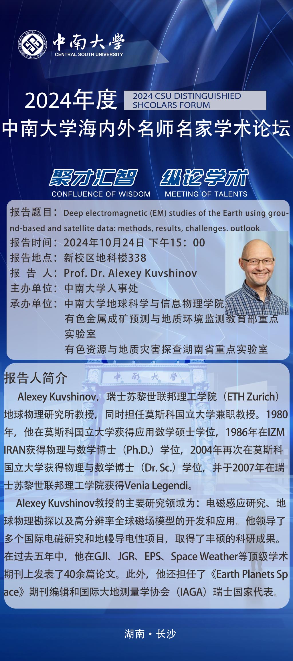 学术报告: Deep electromagnetic (EM) studies of the Earth using ground-based and satellite data: methods, results, challenges, outlook