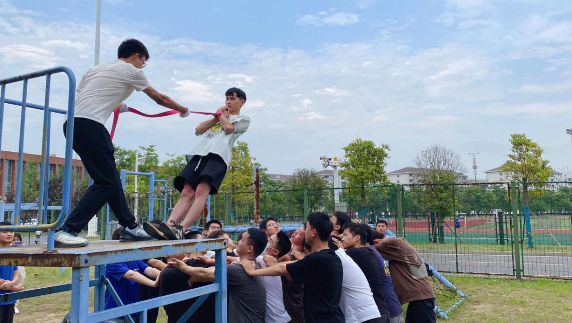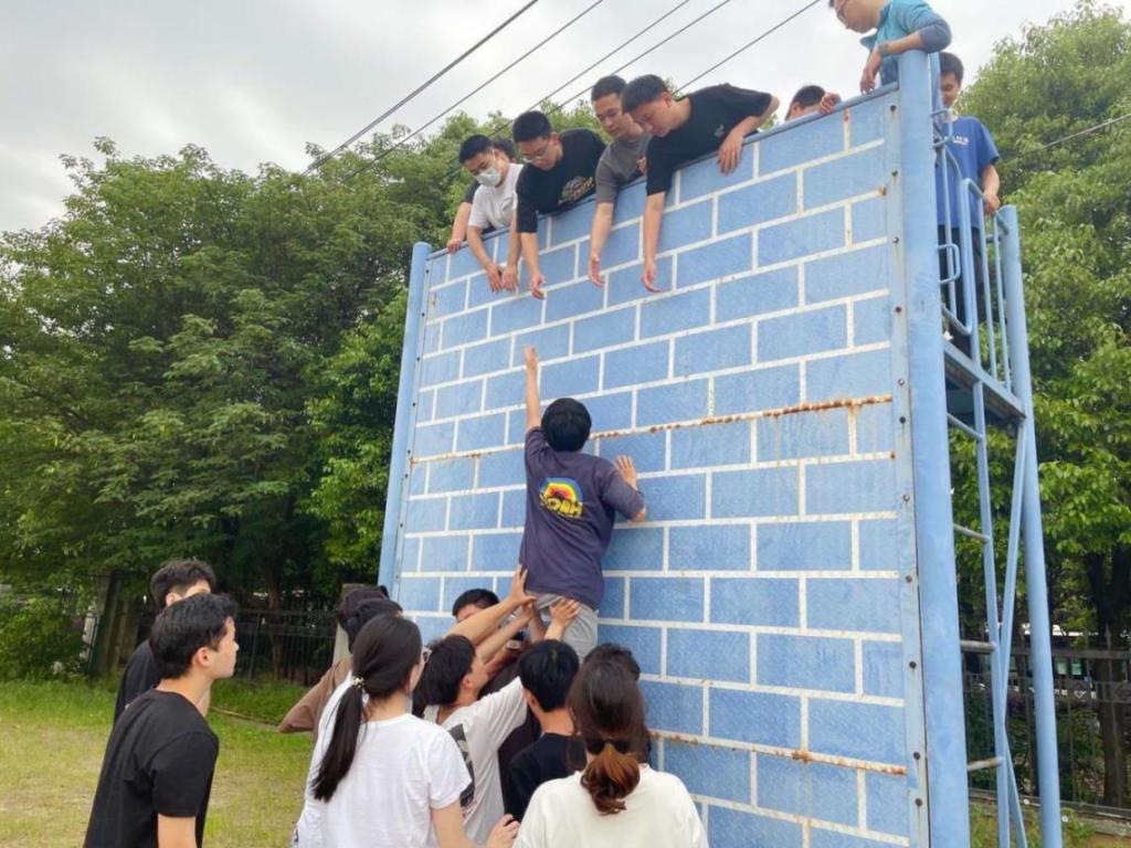 活动最后一项,翻越高达4.2米的“毕业墙”。最后一项挑战也是最有难度的一项挑战,大家凭借着智慧和默契的配合,在不借助其它道具的情况下,所有同志均顺利翻越了这面高达4.2米的“毕业墙”。这项挑战加强了同志们对彼此的信任,磨练了同志们的意志,提高了同志们解决问题的能力。相信在未来,每个人都会带着这份智慧、勇敢和对彼此的信任,跨越重重困难,团结一心向上,持之以恒向前!