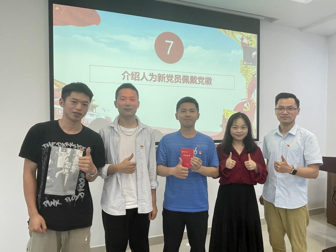 会议最后,在彭璐同志的带领下,支部全体同志进行了入党宣誓,这也标志了七位发展对象同志正式成为预备党员,为支部增添了新的活力。随后支部书记杨通田同志对加入支部的七位新同志表示了自己的期盼,希望他们能够不断增强入党的光荣感和责任感并始终以优秀党员的标准严格要求自己,最后对集体学习内容以及党课培训给予肯定并做出总结。