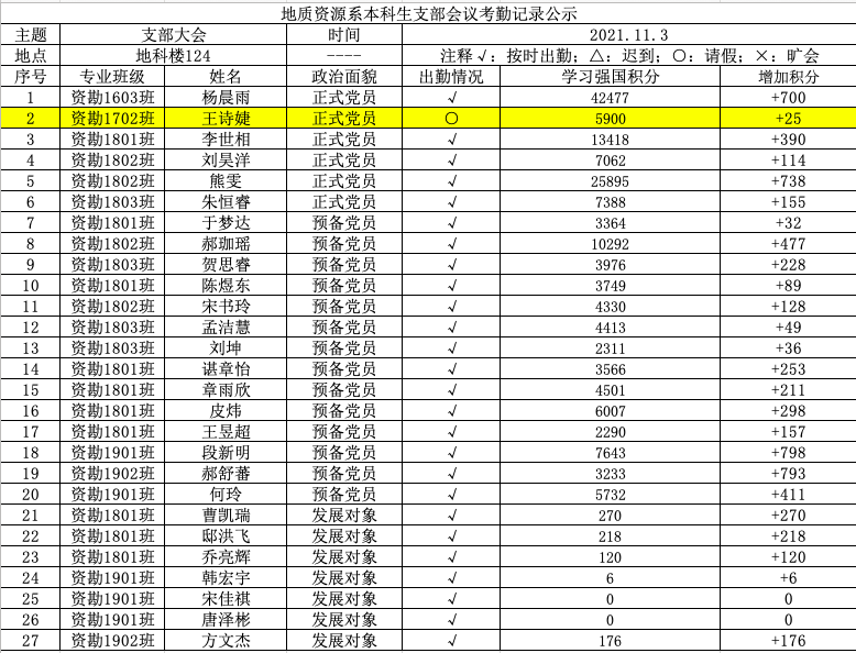 此次会议要求明确,会议的顺利召开使支部同志对党的纪律要求有了更加深刻的理解,相信支部的同志们再接下来的工作生活中定能严明纪律,更好地完成接下来的工作。至此,地质资源系本科支部全体党员大会顺利结束。