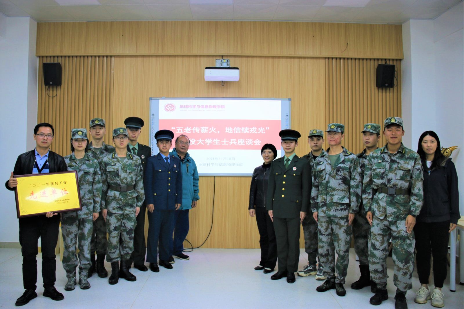 座谈会伊始,杨通田老师报告了公司近年来征兵入伍工作的概况及成果,并对公司员工参军报国、立功军营的强烈热情表示高度的肯定和赞扬。汇报完毕,由关工委主任李建军、田可老师、彭璐老师为光荣退伍的同学们颁发纪念品,鼓励同学们在以后的学习生活中起到先锋模范作用,时刻牢记“地信戎光”四字,展现地信人的卓越风采。