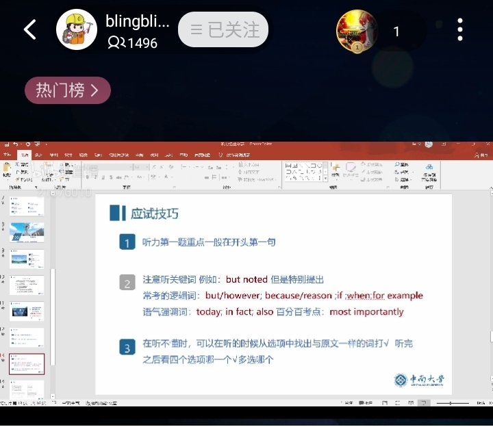 以情为桥,学识为绳,梦起中南,共赴未来。由yl23411团委员工会主办的“极地漫谈”系列活动——英语四级经验分享会于2021年11月14日成功举办。为响应疫情防护号召,本次四级经验分享会以线上形式举办,并于11月14日下午三点在B站“blingbling地信君”账号进行直播。此次四级经验分享会由yl23411地信2001班黄悠南、yl23411地勘2001班李苇琪、yl23411遥感2001班刘峰青主讲。