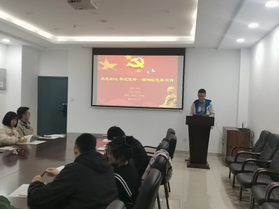 会议开始,首先进行微党课比赛。支部成员自由组队,共分为四组,所选主题有湖湘红色文化——现代人的坚守、湖湘红色文化——刘少奇同志、不忘初心,牢记使命——湖湘红色英烈传、湖南红色文化——湖南农民运动,在汪晓龙同志介绍本次比赛规则后,每组根据抽签顺序派代表进行讲授。在讲解过程中,每一位党员都认真的聆听并学习,深深为湖湘红色文化动容,更加坚定自己的入党初心,决心担负起新时代的使命。