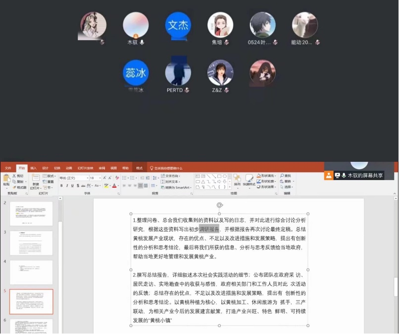 首先,因为疫情影响实践由线下改为线上,团队成员在带队老师的指导下召开第一次线上会议,进一步商讨和确定线上实践各项活动具体开展的形式。会议期间,团队成员对收集的资料进行了充分的讨论沟通,以确保后期的实践顺利进行。