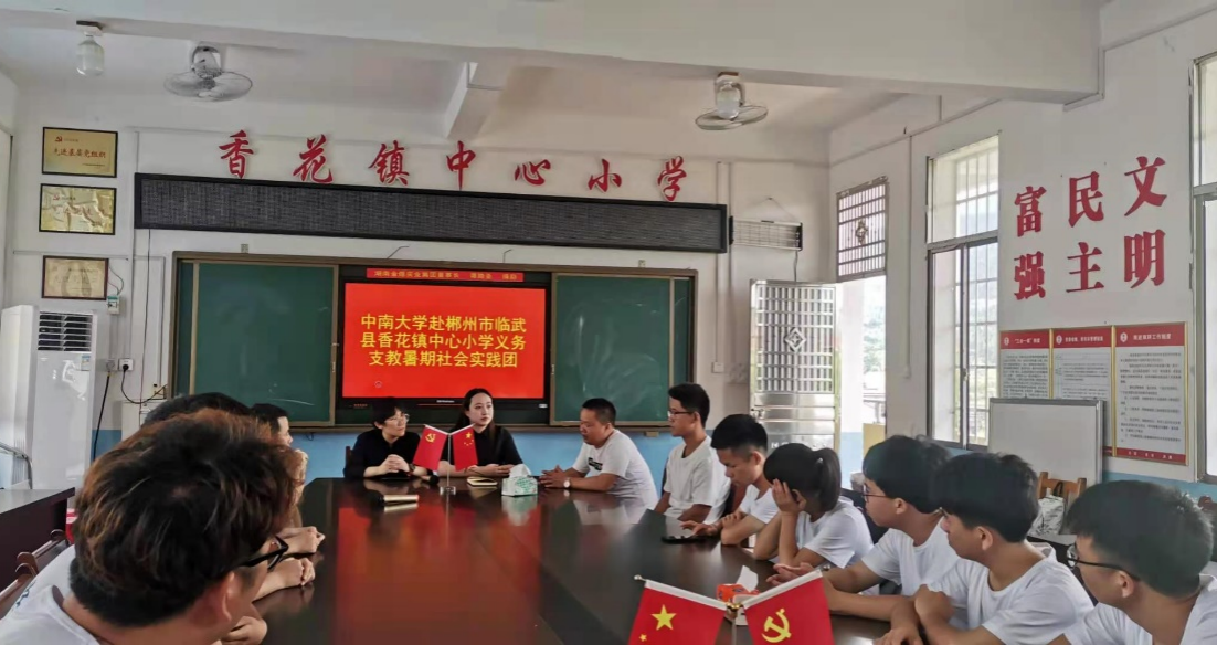 香花镇小学董事长周武专,对义务支教实践团表示诚挚而热烈的欢迎,对本次活动给予最大程度的支持。他向团队详细介绍了当地和公司的基本情况。为促进环境治理,近几年矿山的整顿导致工作机会的缺失,进一步导致家庭经济出现风险,于是出现了一部分留守儿童。由于缺乏家长的关心和教育,孩子们在学习上的专注力还有待提高。虽然之前也尝试过培优辅差的方案,老师也认真负责、默默付出,但因一些原因难以坚持下去。总之,董事长用了一个形象的词“洗脑”,让孩子们看到更广阔的世界,坚定通过学习走出大山的决心,来表达对本次活动的寄予。