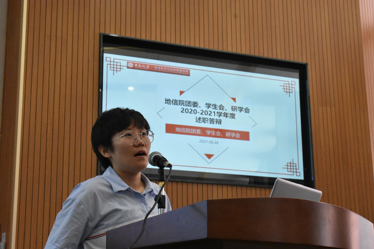 接着,团学会各部门依次进行部门年度工作总结。生活部部长梁泉、实践部副部长侯霞、宣传部部长徐晨、学习部部长方文杰、权益部部长单宝俊、办公室主任张凌云、组织部部长徐倩、体育部部长王浩然、文艺部部长李慧玲同、社团部部长邹一依次上台,就各自部门的思想引领、部门工作、特色活动、不足与改进方法、成长感悟五个方面进行了充分细致的总结报告。