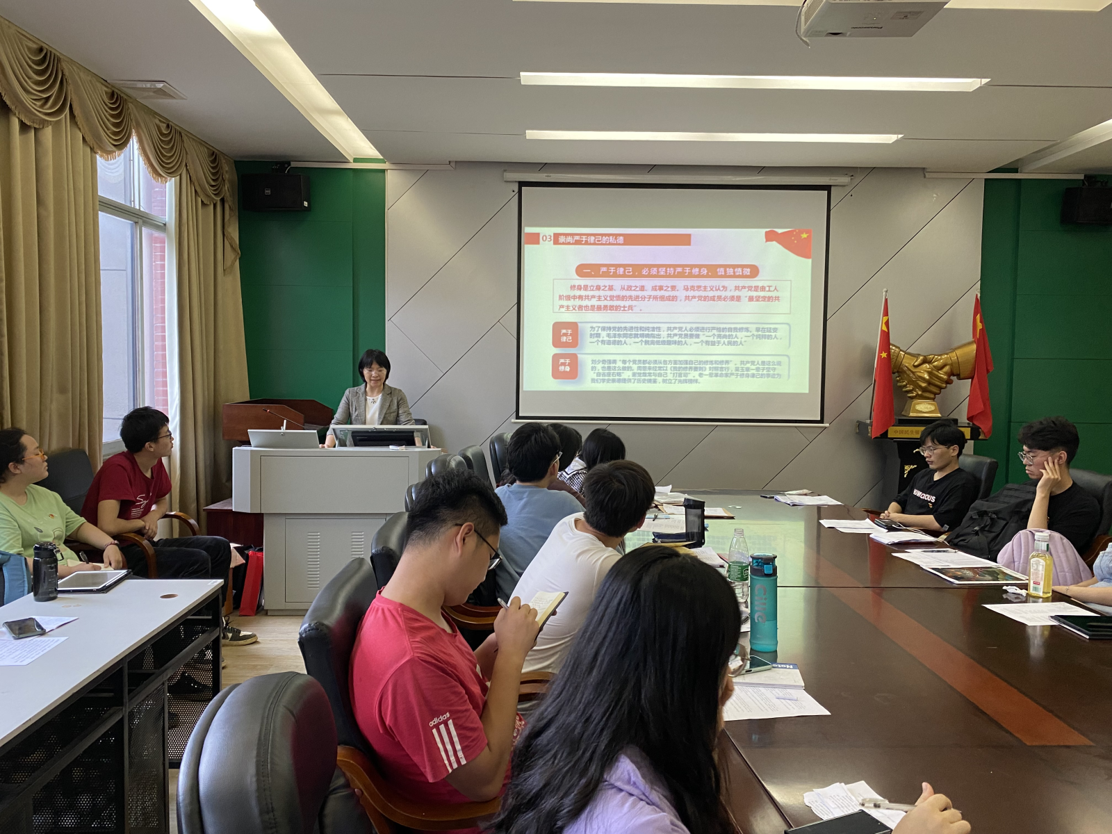 会议第四项,李建军副书记给支部成员上了一堂生动的“学史崇德”专题党课。她从崇尚“对党忠诚”的大德、“为民造福”的公德和“严于律己”的私德三个方面诠释“学史崇德”的内涵,最后推荐了有关“学史崇德”的参考书目。本次党课强调,党员要对党忠诚,谨记执政为民的初心,同时也要修身律己,发扬红色传统,延续革命精神。