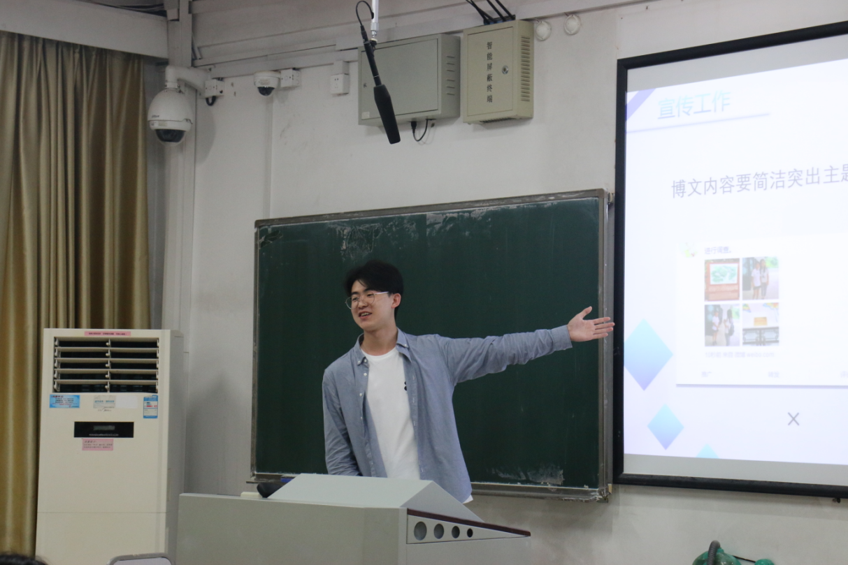 任嘉龙同学针对暑期社会实践宣传工作要点、新闻稿件投稿要求、暑期社会实践总结工作内容进行了详细讲解。他结合自身社会实践经历,分享了社会实践团队宣传、记录和投稿的经验,强调团队特色与实时记录,并分享了往届在评比中取得不俗成绩的团队的优点,解答了如何在中后期评奖评优中脱颖而出的问题。言简意赅、有的放矢的讲解,解答了同学们最为关切的疑问,为有效地开展实践活动工作提供了宝贵的建议。