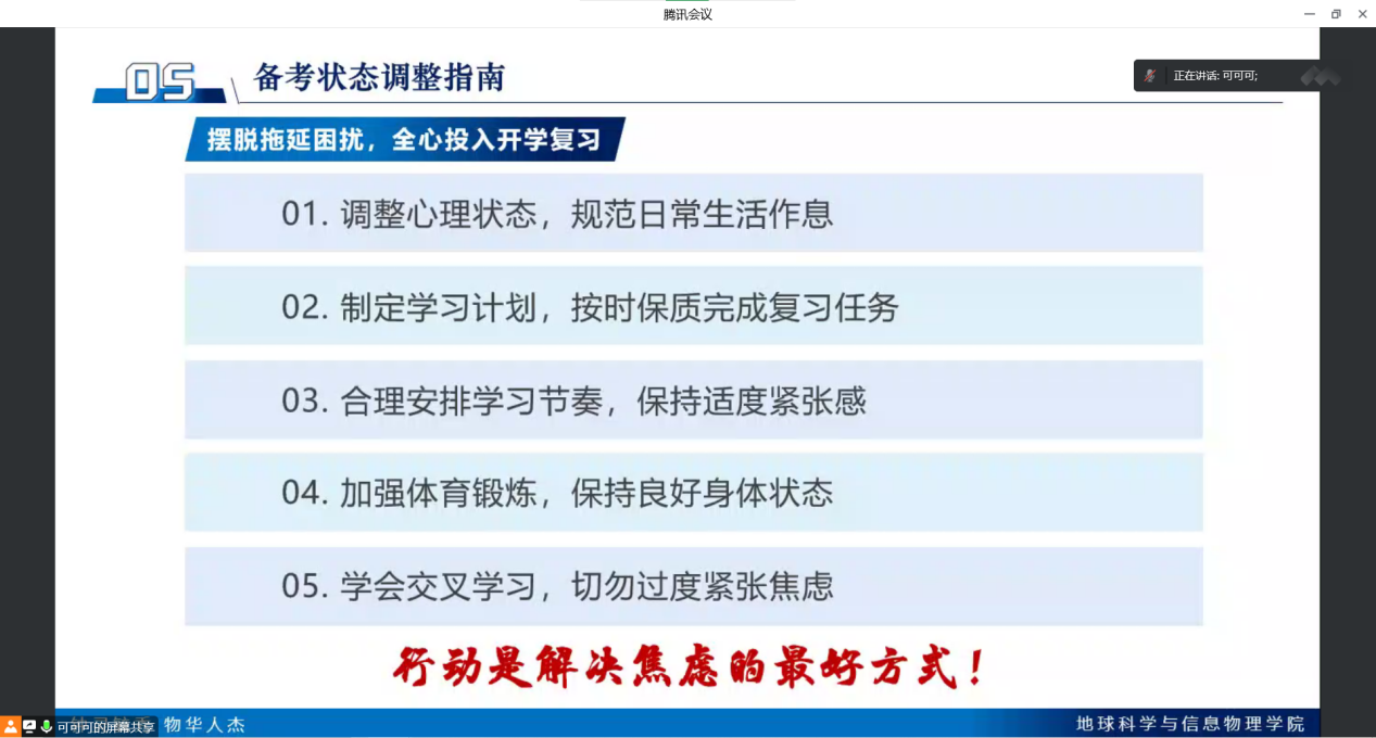 至此,本次会议圆满结束。大会围绕寒假复习工作进行了动员,解答了同学们热切关注的问题,给同学们提供了许多切实可行的建议,希望同学们能尽快调整复习状态,积极备考开学初的课程考试。