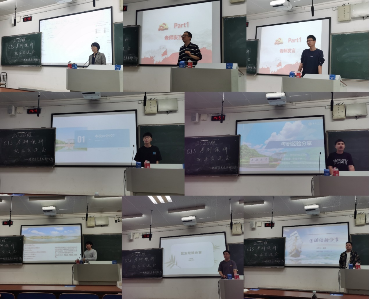 随后,苟震波、王宪彬、曹志斌、李威、雷文韬等5位19级同学,分别就保研、考研、就业、选调生、出国留学等五个方面进行经验分享。苟震波同学结合自身直博经历,主要介绍了保研流程,分享了材料准备、导师选择等方面的经验;王宪彬同学分享了考研备考经验,详细介绍了考研的具体流程和时间分配,重点强调了部分考试科目备考要点;曹智斌同学针对求职问题,建议同学们准备一段实习经历,在秋招、春招中多尝试、多锻炼,并分享了面试技巧和注意事项;李威同学针对备考选调生详细介绍了备考方法、初试及复试准备等内容,鼓励同学们扎根基层奉献青春;雷文韬同学主要围绕GIS专业院校简介及如何准备留学等两个问题,详细介绍了留学所需材料与准备流程。