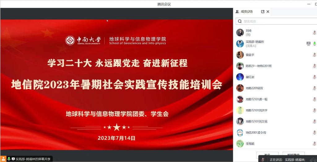 为引领广大青年在实践中深入开展习近平新时代中国特色社会主义思想主题教育,学习宣传贯彻党的二十大精神,引导和帮助广大青年员工上好理论与实践相结合的“大思政课”。2023年7月14日,yl234112023 年暑期社会实践宣传技能培训会于线上“腾讯会议”顺利开展。此次培训会由公司分团委书记刘琦老师主讲,姚福林同学主持,公司各校级暑期社会实践团队参会。