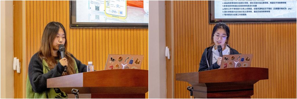 在新媒体运营和摄影技能培训会上,曹燕飞同学针对微信公众号的日常运营,结合公众号封面、简易海报、排版设计等公众号运营流程进行了详细培训。欧馨潞同学结合相机部件的功能版块和后期图像处理常用软件,详细地向大家讲解了摄影采编和后期处理要点。