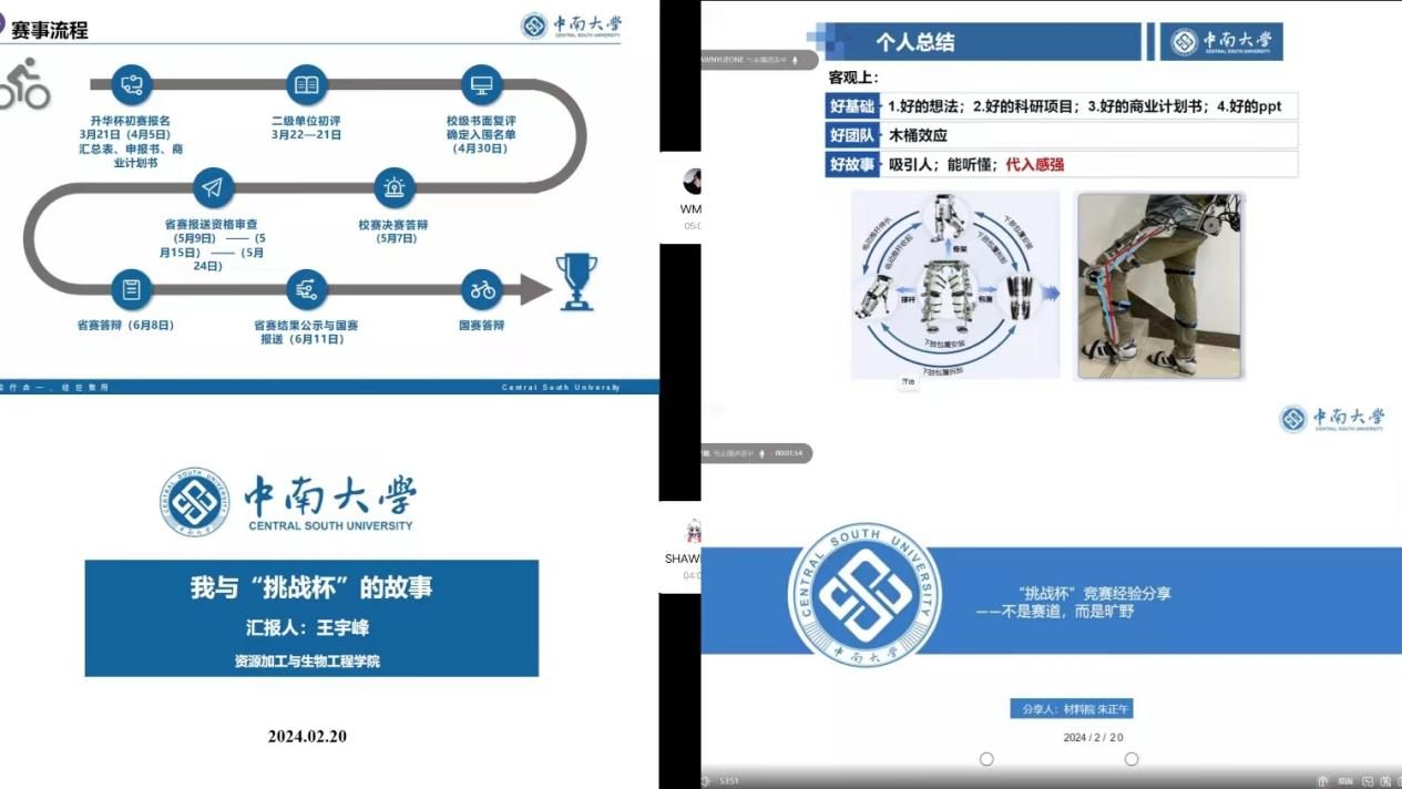 培训会上,主讲人王宇峰同学分享了他与“挑战杯”之间的故事,他的经验和故事给大家带来了很多启发。接着,主讲人朱正午同学围绕竞赛规划、文书书写、答辩准备、工业生产需要等方面内容进行了细致分享,为同学们提供了丰富的参赛经验干货。在提问环节,同学们针对“升华杯”的分工、团队等方面存在的问题积极请教,主讲人耐心答疑。