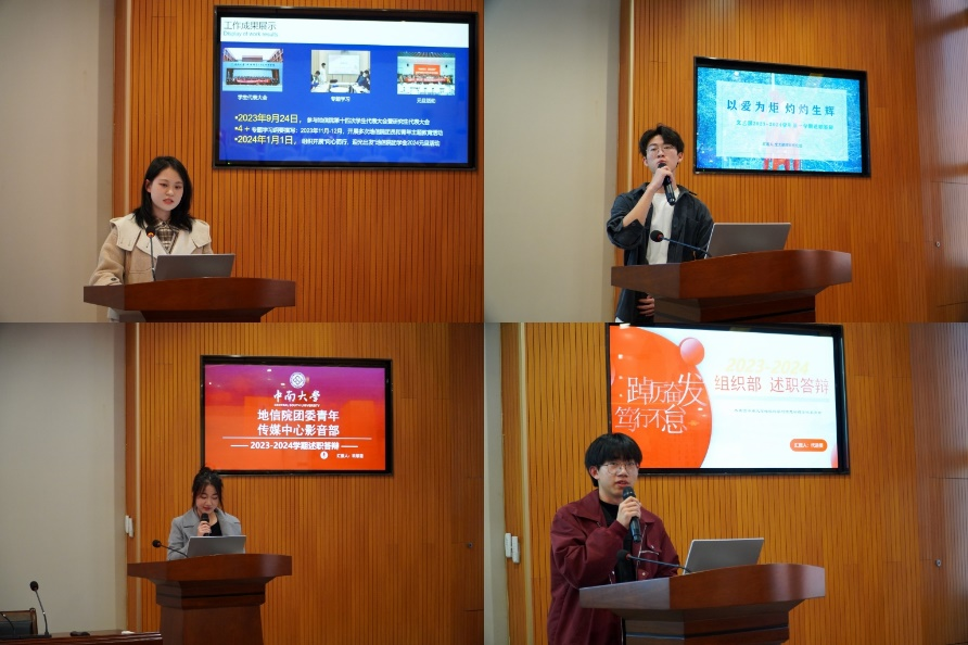 答辩正式开始,13位部门负责人依次进行了述职答辩。各部门负责人从部门发展建设、部门工作总结、部门未来工作展望等方面对部门第一学期工作情况进行了详细展示。答辩结束,参评代表依据思想建设、部门建设、工作成效和答辩风采四部分的评分标准进行无记名打分。