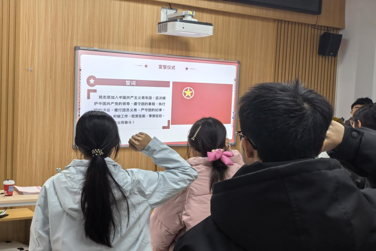 仪式第一项,奏唱国歌。随后,由院团委组织部副部长丁若涵宣布新团员名单,新团员们在领誓人的带领下庄严宣誓。宣誓结束后,院团委员工副书记杨颜瑞逐一为新团员佩戴团徽。接下来,新、老团员代表宋朗卿、丁若涵同学依次发言。宋朗卿同学分享了入团激动的心情与奋斗目标,表达出紧跟组织、积极进取的信念;丁若涵同学结合自身经历寄语新团员,鼓励大家珍惜身份、锤炼本领。紧接着,由杨颜瑞同学就《入团志愿书》填写规范要点进行了集中培训。