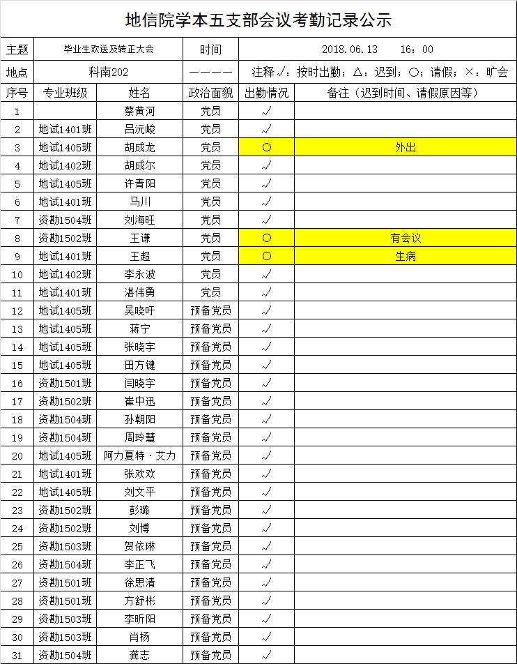 2018年6月13日下午,yl23411学本五支部召开支部党员大会,开展党日活动欢送毕业生党员并进行预备党员转正大会。将出勤情况公示如下,接受党内外群众监督。