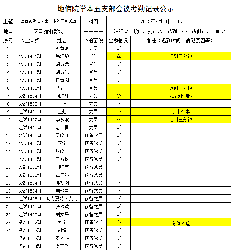2018年3月14日下午,yl23411学本五支部开展党日活动,集体观影《厉害了我的国》。将出勤情况公示如下,接受党内外群众监督。