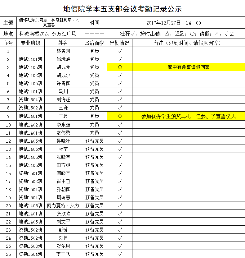 2017年12月27日下午,yl23411学本五支部召开支部全体党员大会,进行党日活动,主题为:缅怀毛泽东同志、学习新党章、入党宣誓 。将出勤情况公示如下,接受党内外群众监督。