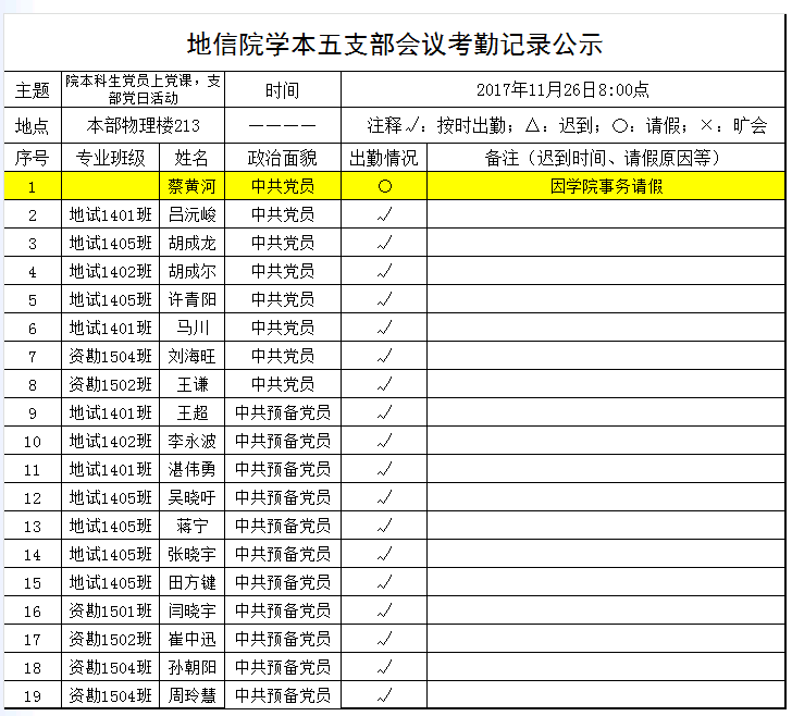 2017年11月26日上午,yl23411学本五支部召开支部全体党员大会,组织党日活动,主题为“十九大报告宣讲”、“中纪委向十九大所作报告宣讲”的学习。将出勤情况公示如下,接受党内外群众监督。
