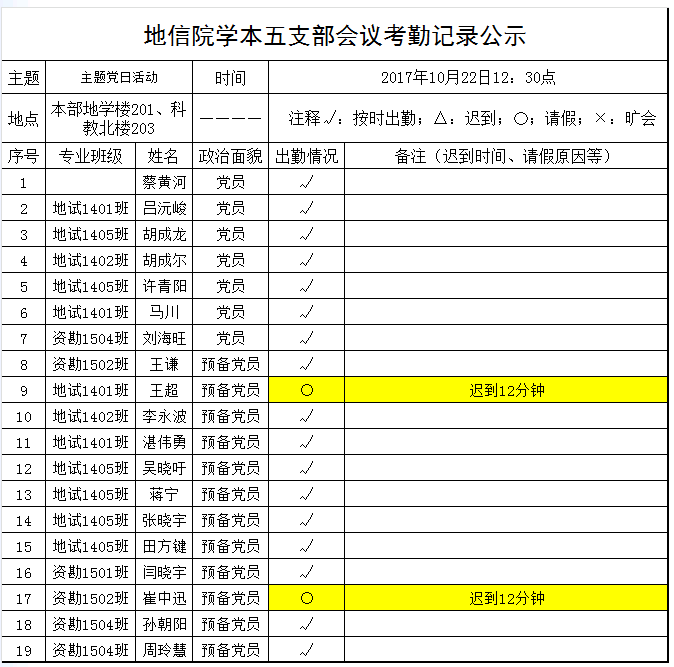 2017年10月22日,yl23411学本五支部召开支部全体党员大会,组织党日活动,主题为学习习近平总书记代表第党的十八届中央委员会在中国共产党第十九次全国代表大会上向大会做的报告。将出勤情况公示如下,接受群众监督。