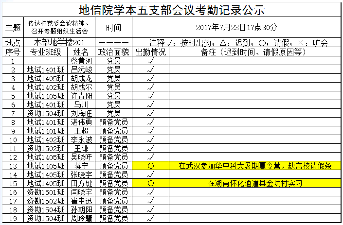2017年7月23日yl23411学本五支部会议考勤公示