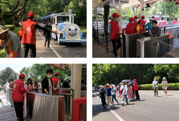 上午8:15,小队全体成员按时到达游客服务中心,在景区工作人员的引导下完成相关准备工作后正式投入志愿服务中。小队成员们穿上小队自制的志愿者服务马甲,分为三组,在橘子洲不同区域开展志愿服务活动。第一小组主要负责对小火车终点站的乘客进行疏导以及提供咨询服务。小队成员需要在小火车到达前阻止过马路的游客并引导游客们安全进入人行道。同时,小队成员也耐心回答游客们的各种问题。第二小组成员主要担任检票员工作。小队成员需要负责维持橘子洲观光火车返程入口的旅游秩序,营造良好的自觉排队氛围,维持入口进站检票的持续畅通。第三小组成员主要负责非物质文化遗产展示馆处交通与游客的疏导。非遗馆处是一大交通要道,加之游客问路频繁使得交通情况复杂,小队成员负责进行交通和游客的疏导,帮助区分开车行道与人行道,把控车辆与行人的行进。小队成员在志愿服务中竭力满足每一位游客的需求,进一步传承和发扬“奉献、友爱、互助、进步”的志愿精神,得到了广大游客的高度认可。活动最后小队成员共同前往毛主席石像前合影留念。