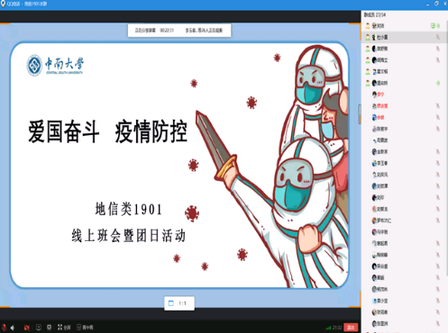 2月28日晚19:30,地信类1901召开了此次线上班会暨团日活动。本次班会的主题是“爱国奋斗,疫情防控”。