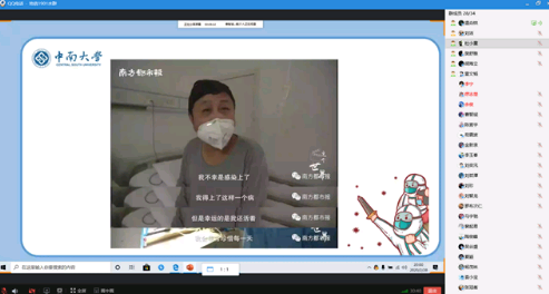 团支书温焱烘开始了本次的团日活动。本次团日活动的主题是“齐心防疫,从我做起”。团支书为大家播放了一段讲述新冠疫情下武汉人民抗击疫情的视频。视频中,医生鼓励患者,患者间互相鼓励,医患同心,共战疫情。