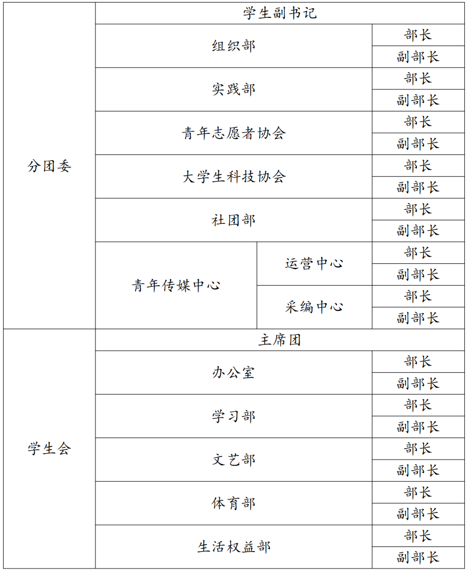 5.原则上竞选员工会主席团、分团委员工副书记职位者须有一年及以上分团委、员工会主要干部任职经验;如竞聘人在其他校级员工组织、党支部、团支部、班委会、社团及其他员工组织有一年及以上工作经历且能力突出者,也可参与竞选。